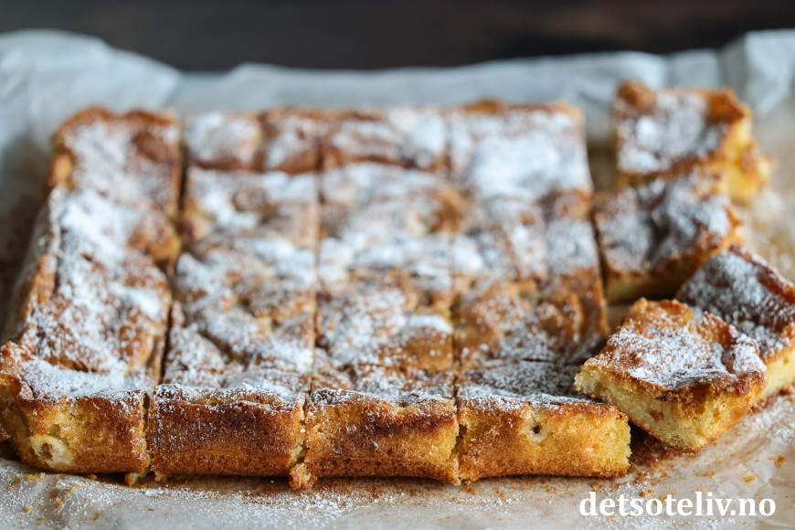 ♥ Denne kaken skal bli myk og litt fuktig inni, så den trenger ikke så lang steketid. Kaken blir fastere av å stå kjølig, så det kan være lurt å la den forbli i formen og sette den i kjøleskapet over natten. Da blir det lett å løfte kaken ut av langpannen uten at kaken går i stykker.
