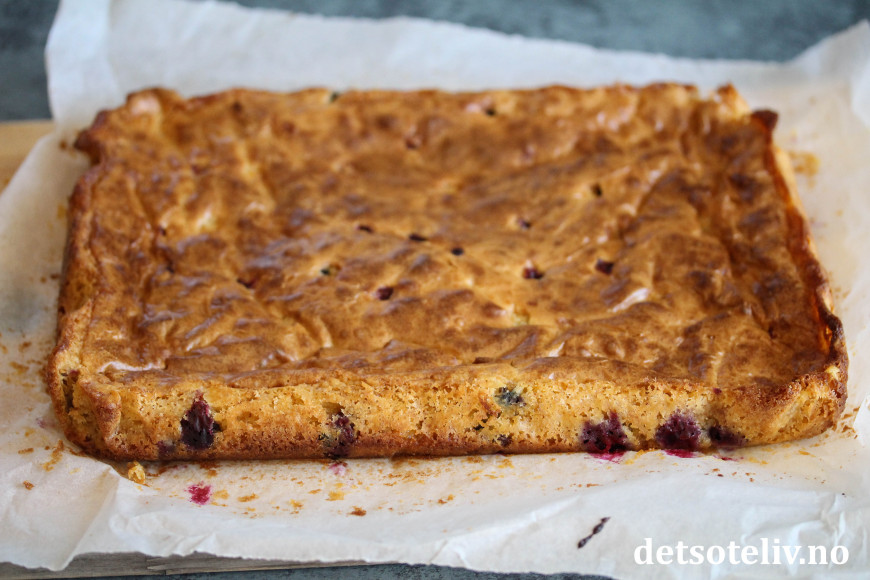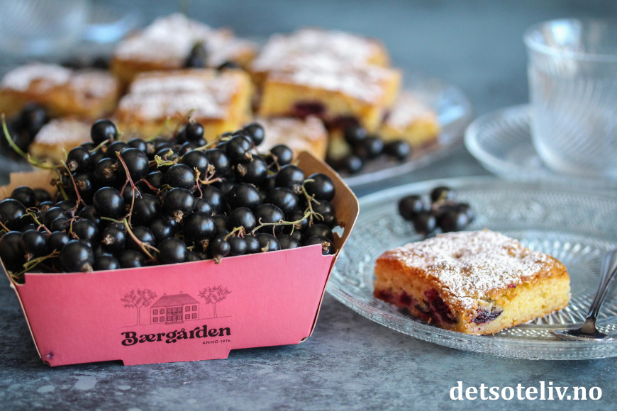 Hell deigen i en liten, bakepapirkledd langpanne (ca. 20 x 30 cm). Fordel resten av de rensede solbærene over kaken.