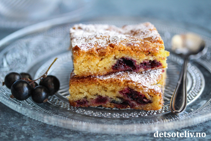 ♥ Jeg bruker noe mer bær i denne oppskriften enn den med rips fordi solbær ikke er like sure som rips. Det å vende bærene i mel gjør at de synker mindre til bunnen av kaken under stekingen. Av samme grunn legger jeg noen bær på toppen av deigen i formen før kaken stekes.
