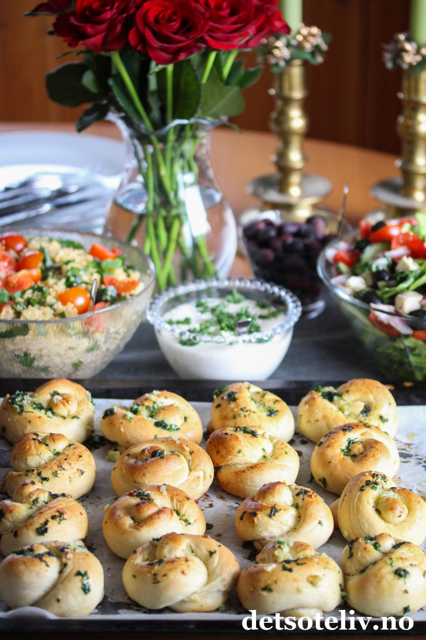 ♥ Hvitløksknutene er ypperlig egnet som tilbehør til salater og middager, men er også kjempegode som de er - eventuelt med litt ost på. Det smaker aller best helt nystekte. De du får til overs kan du sette i fryseren. Varm dem opp i ovnen i noen minutter ved tining, så smaker de som nystekte igjen.