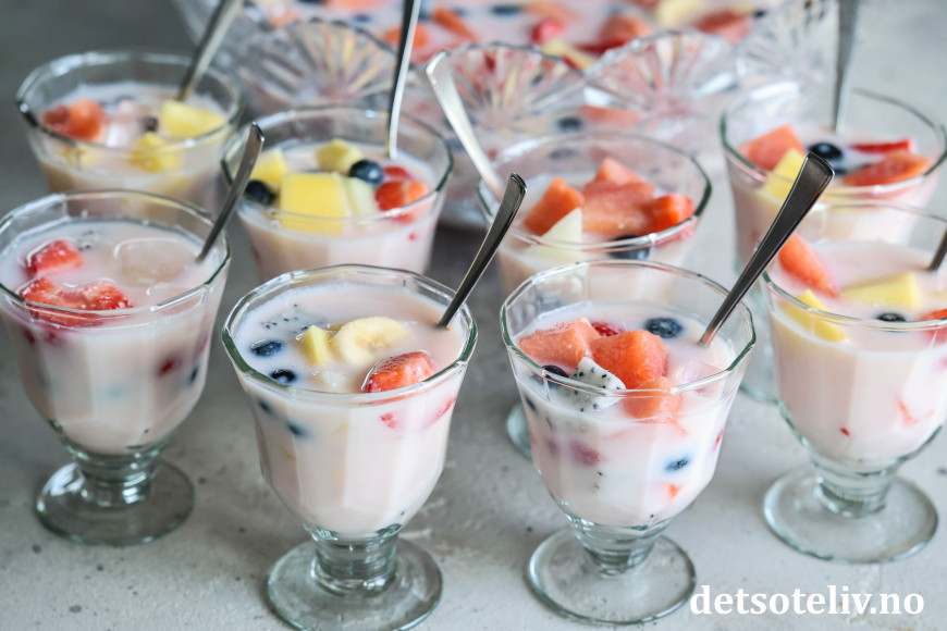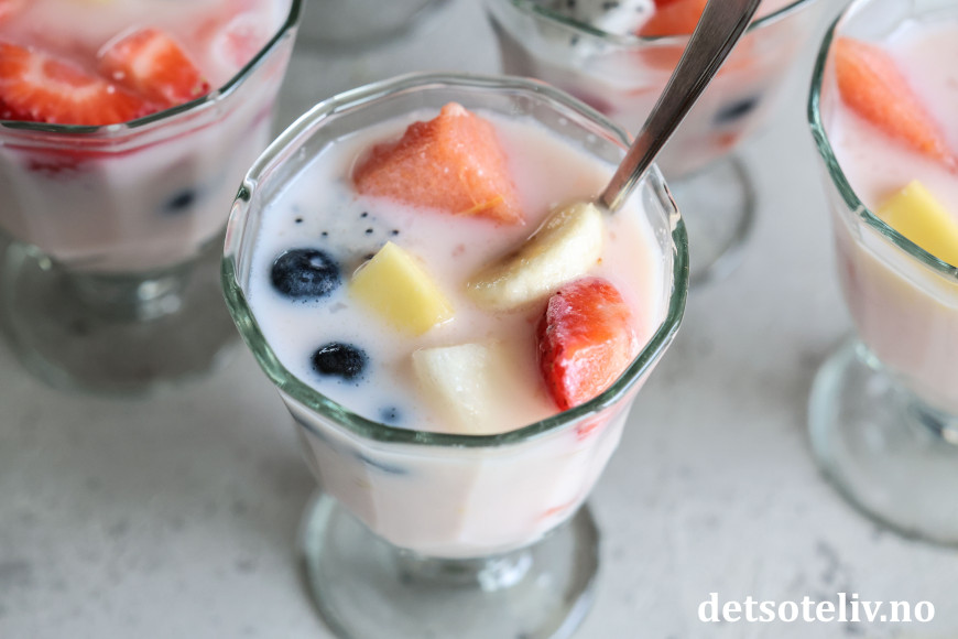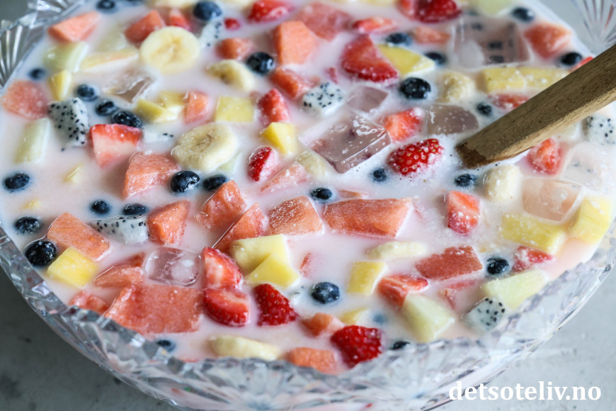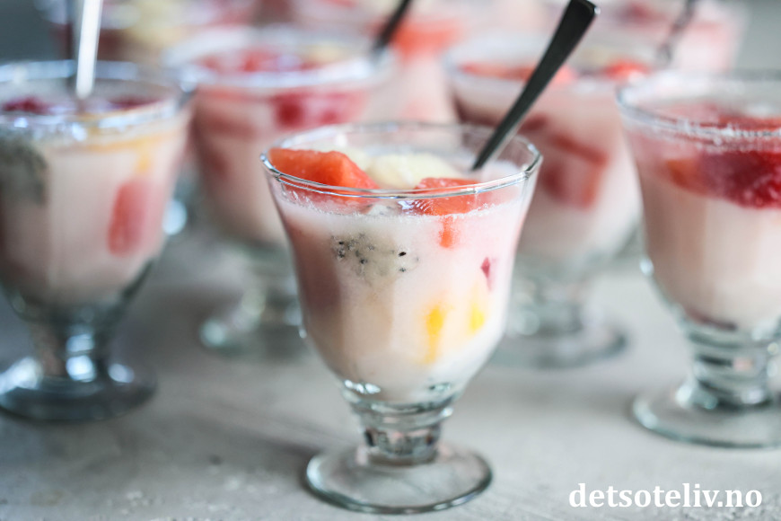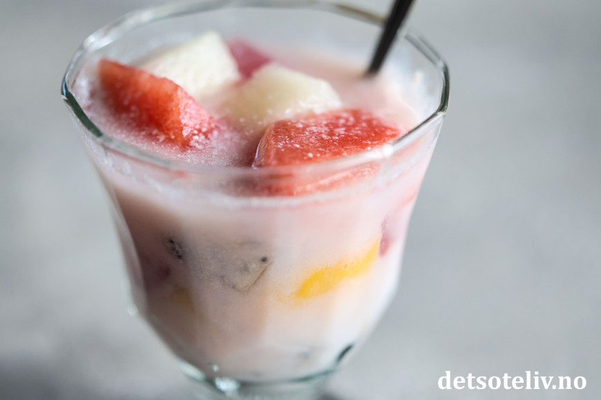 Siden det er så mye fruktbiter i drikken, må den drikkes / spises med skje - så dette blir nærmest som en dessert.