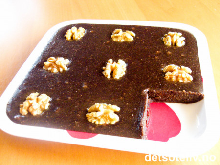 Hell blandingen i en liten form eller asjett med litt høye kanter. Pynt med valnøtter og sett i kjøleskapet over natten.