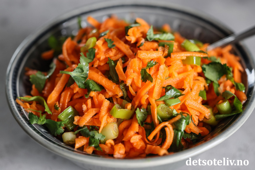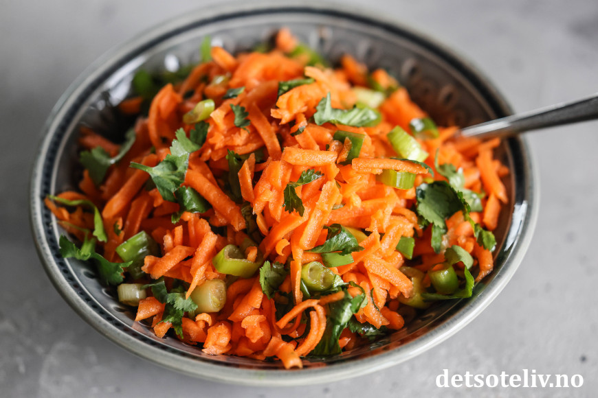 Snitt opp vårløk og hakk korianderbladene (dropp stilkene). Vend dette inn i gulrotsalaten.