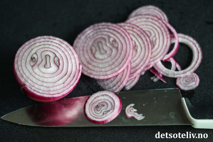 Skjær rødløken i tynne skiver (bruk en mandolin eller skarp kniv).
