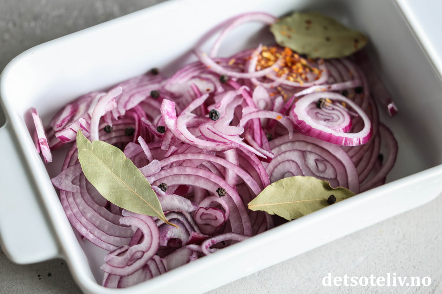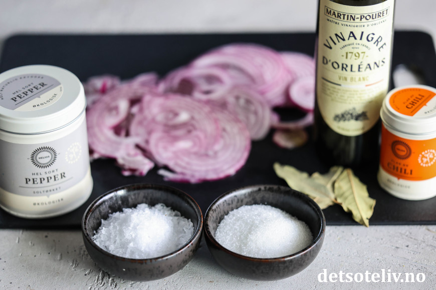 Skjær rødløken i tynne skiver (bruk en mandolin eller skarp kniv). Legg rødløksskivene i en skål med lokk som jeg har brukt her, eller bruk et glass med skrukork. Ha over laurbærblad, hele pepperkorn og chiliflak.