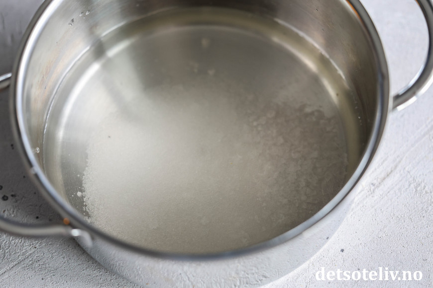 Ha vann, salt og sukker i en kjele. Varm opp og rør til saltet og sukkeret har løst seg opp.