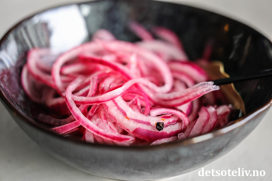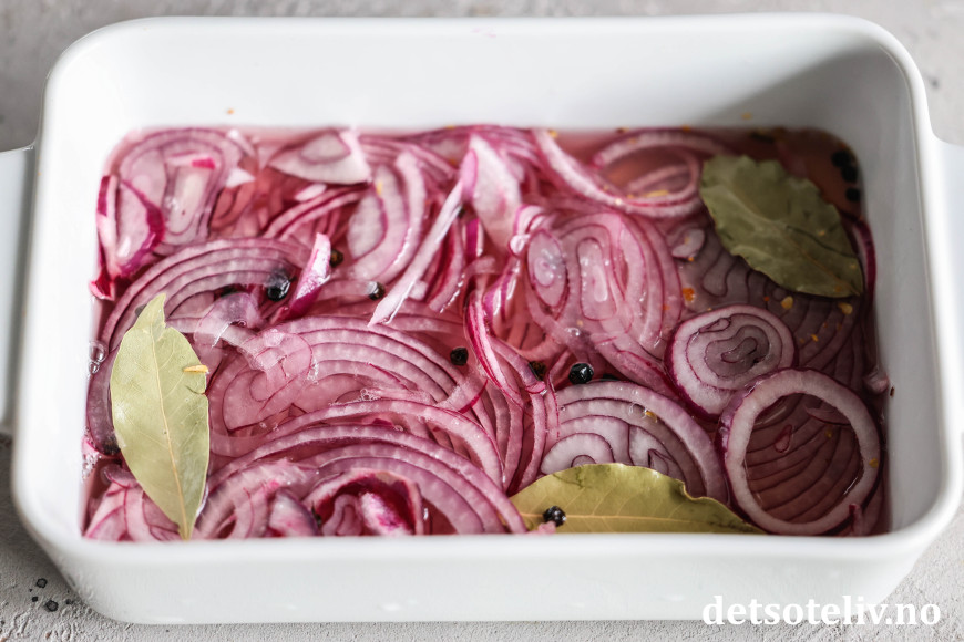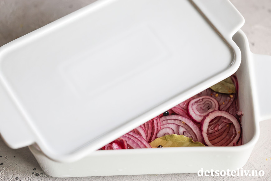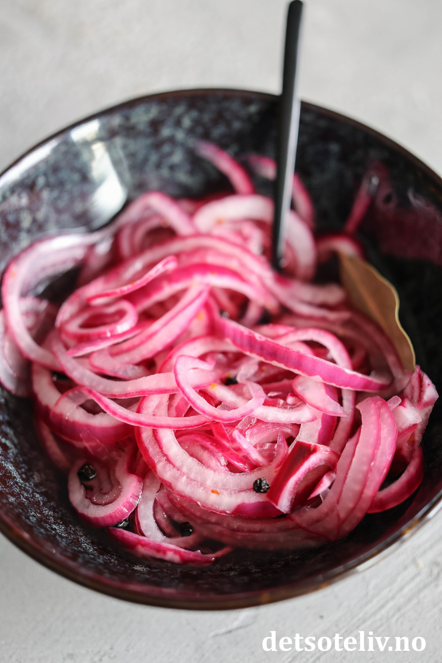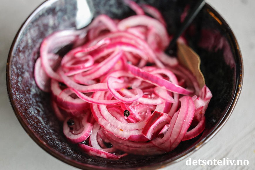 ♥ Du bør la rødløken ligge i laken i minst 2 timer før du bruker den, men veldig gjerne over natten. Løken får mer og mer rosa farge ettersom hvor lenge den ligger i laken.