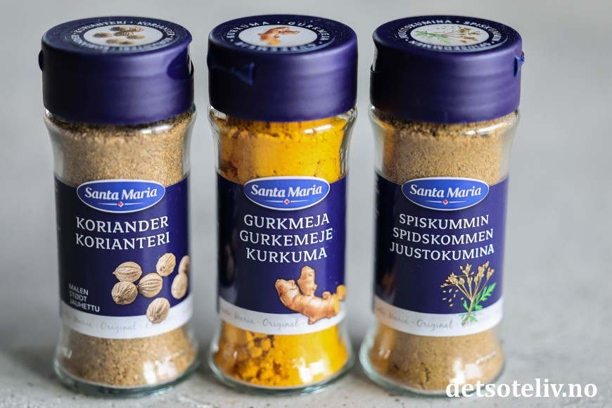 Tilsett malt spisskummin, gurkemeie og koriander.