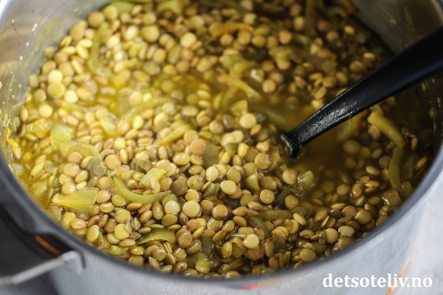 Fyll opp kjelen med kaldt vann. Husk at linsene trekker til seg mye vann når de sveller opp, så la vannet gå godt over linsene (heller for mye vann enn for lite).