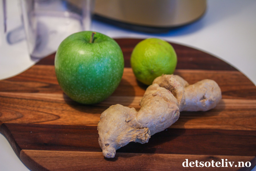 I LA er det jo stort fokus på raw food og helsekost, og man får kjøpt ferdigpressede ingefærshots på mange forskjellige steder. Dette er imidlertid superlett å lage selv også. Jeg bruker en Slowjuicer til å presse juicen fra fersk ingefær. Ja, det er sterkt å drikke ren ingefærjuice, men med eple og lime blir det veldig mye bedre!