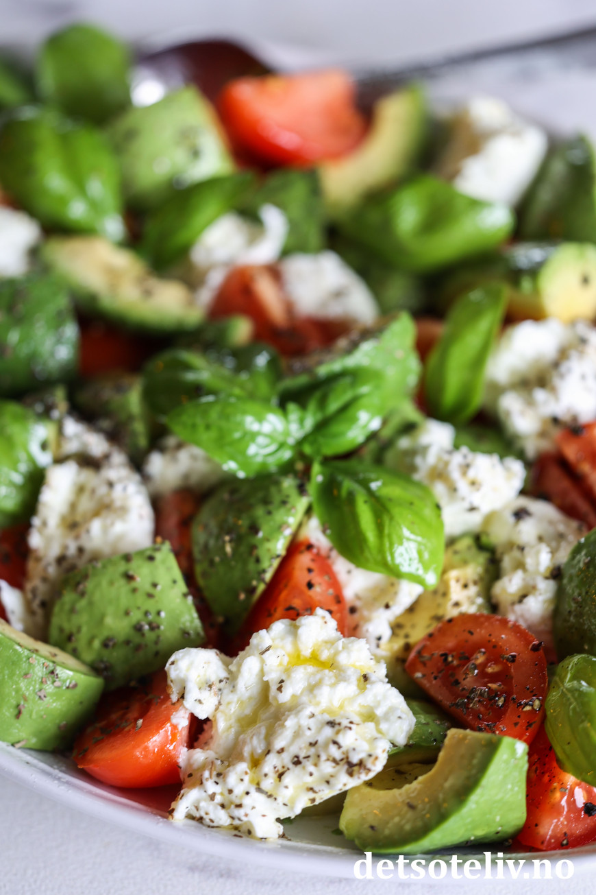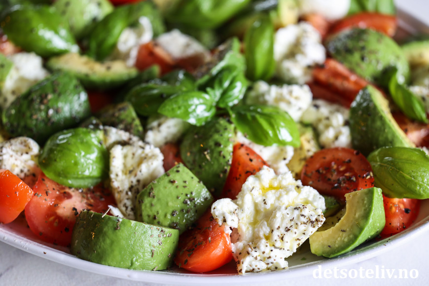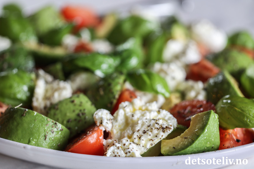 Skjær tomatene i båter og legg på fatet. Skrell avokado og skjær dem i store terninger, som du legger innimellom tomatbåtene.