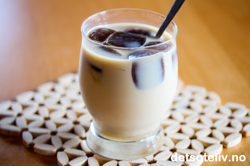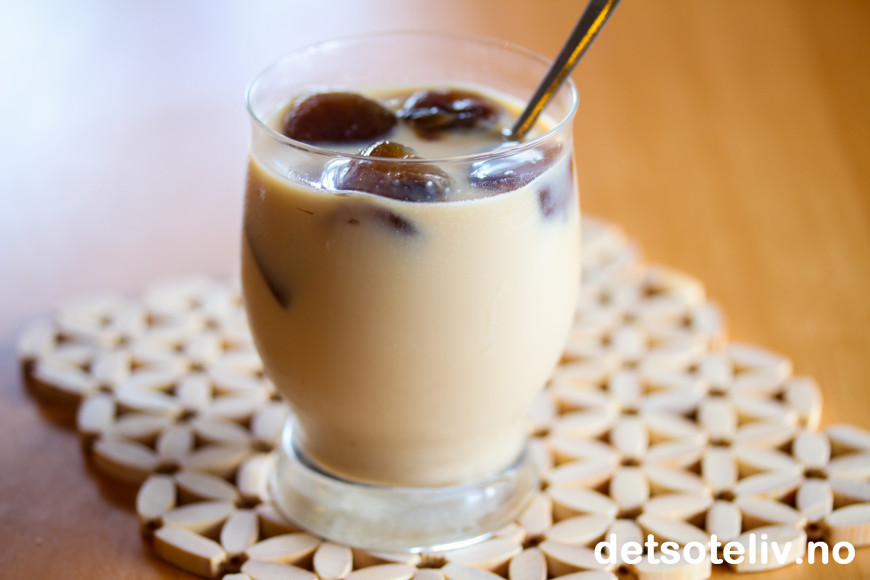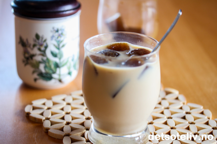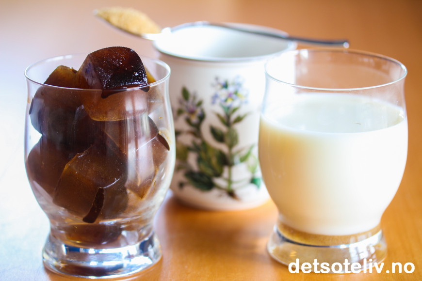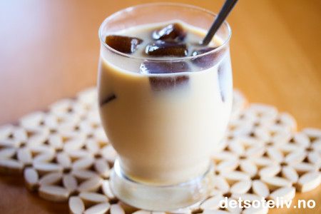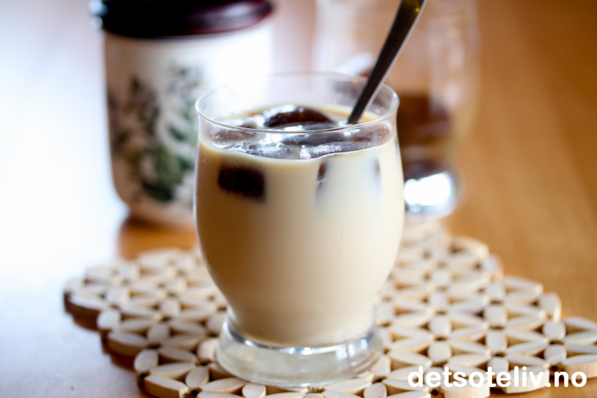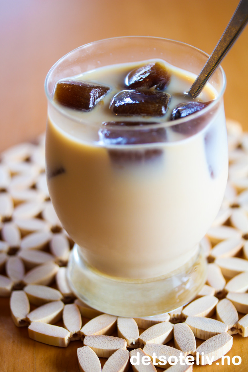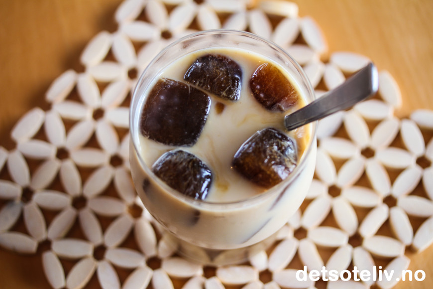 Så er det bare å ha kaffeisbitene i melkeglasset og å smake til med sukker.