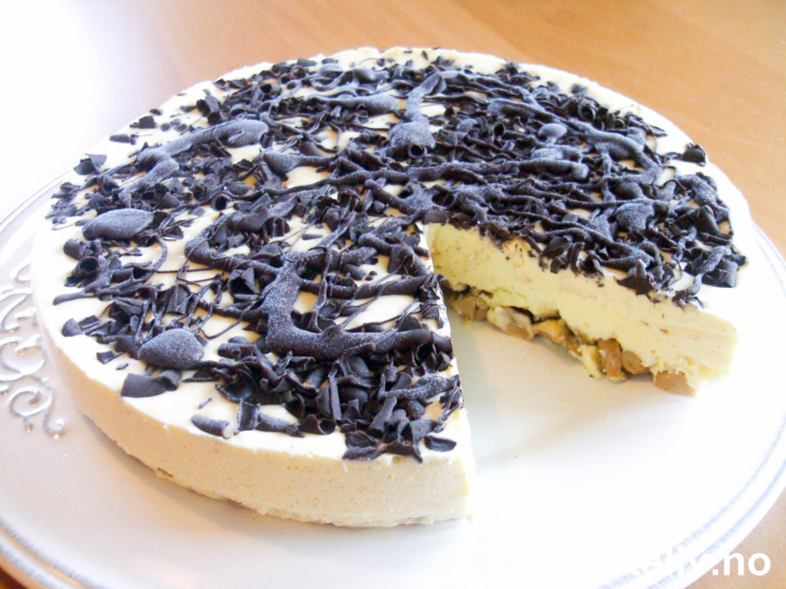 Pisk eggeplommer og sukker luftig. Pisk inn kremosten, vaniljesukker og frøene fra vaniljestangen. Pisk kremfløten til luftig krem og vend i. Hell iskremblandingen i formen og dryss over sjokoladedråpene. Sett kaken i fryseren til isen har stivnet.