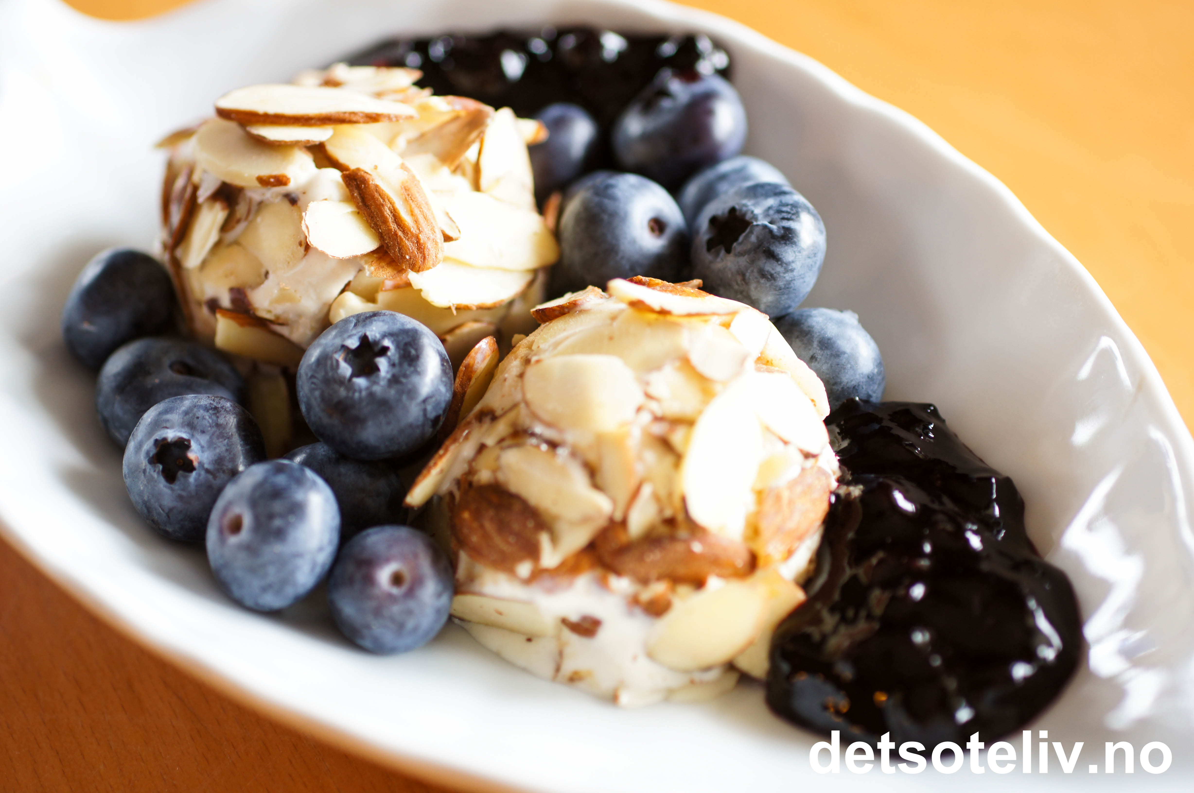 Runde kuler av skikkelig god vaniljeis rulles i mandelflarn. Serveres med friske blåbær og rørt blåbærsyltetøy.