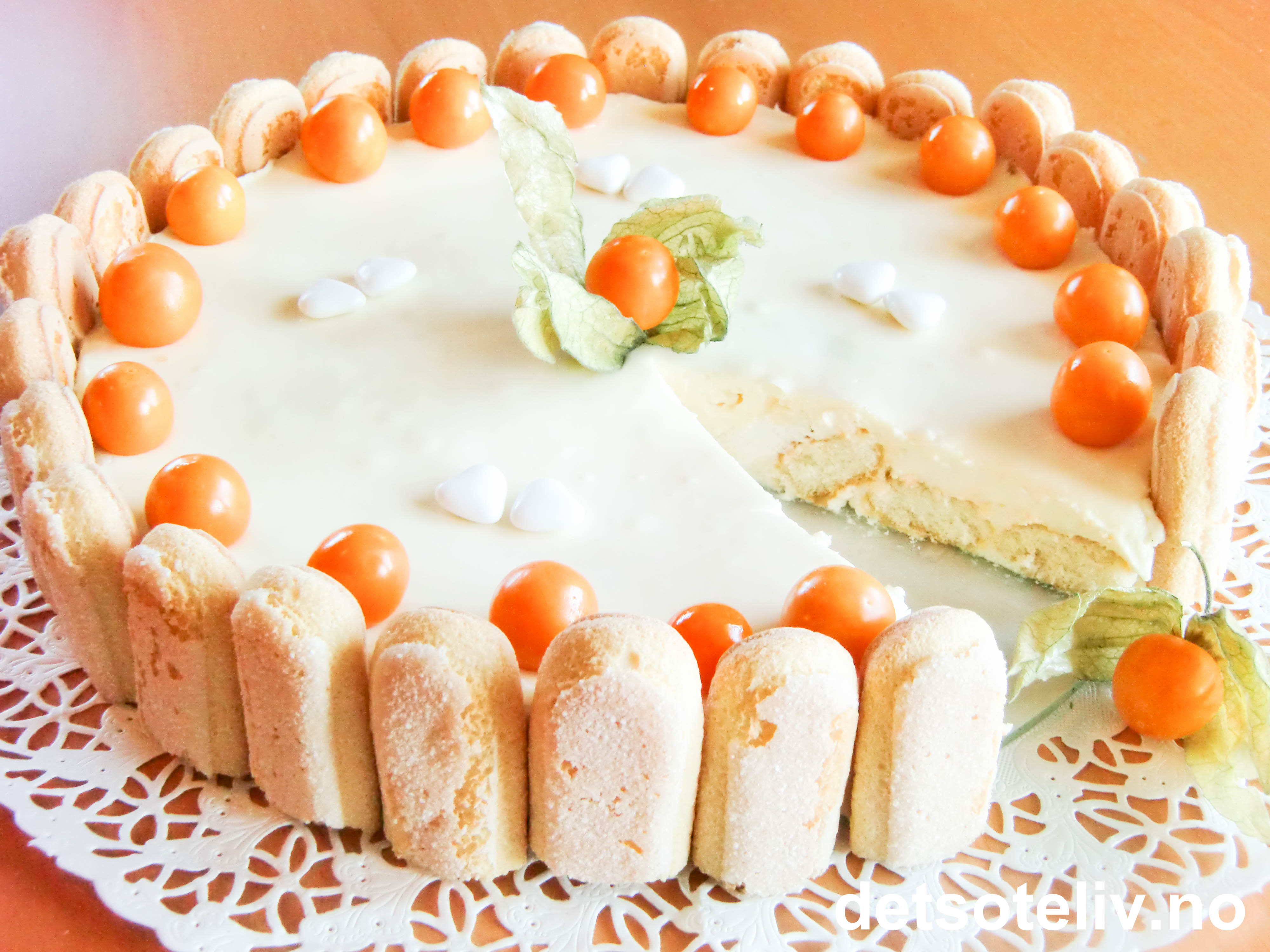 Dagen etter fjernes kakeringen forsiktig. Sett kaken på et passende fat. Pynt kaken med halve savoardikjeks rundt kanten og kjærlighetsfrukter (physalis) på toppen.