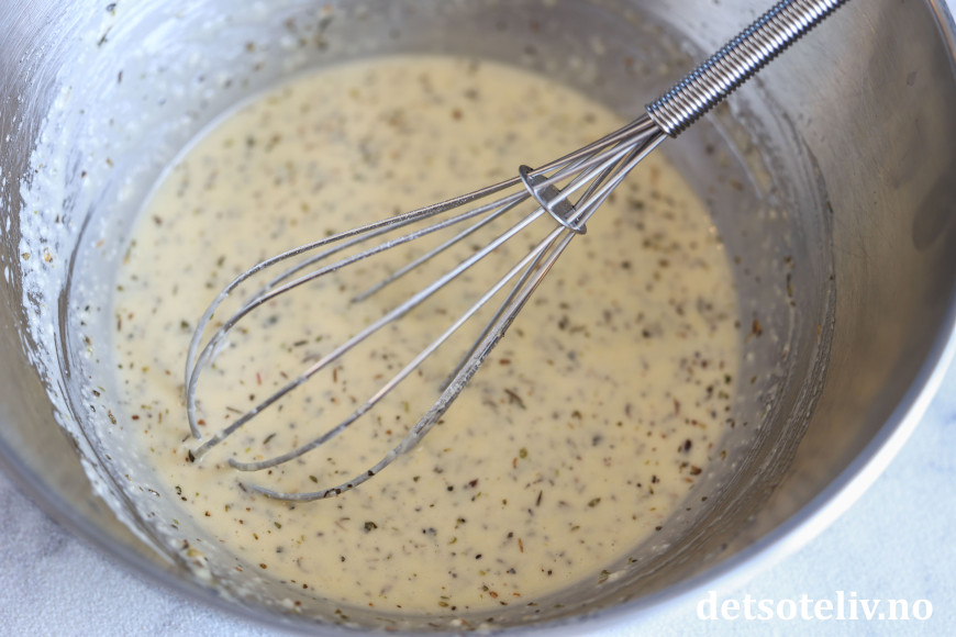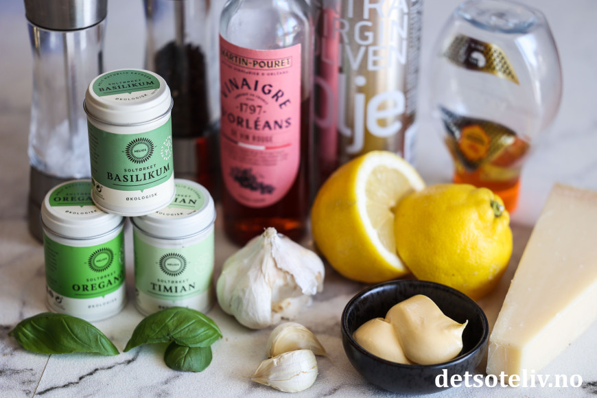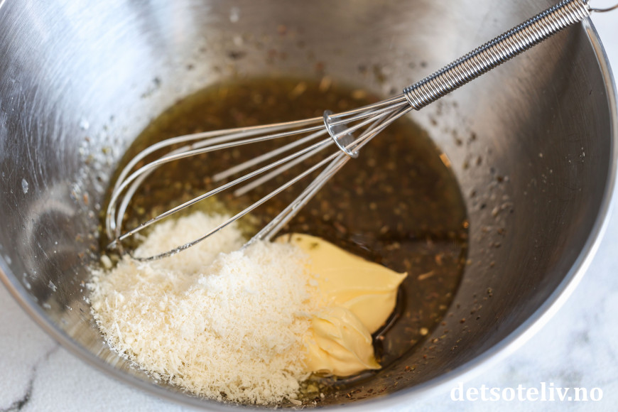 ♥ Jeg bruker her ferdigkjøpt, finrevet parmesan fordi den løser seg opp i dressingen, men du kan gjerne bruke ferskrevet parmesan i stedet.