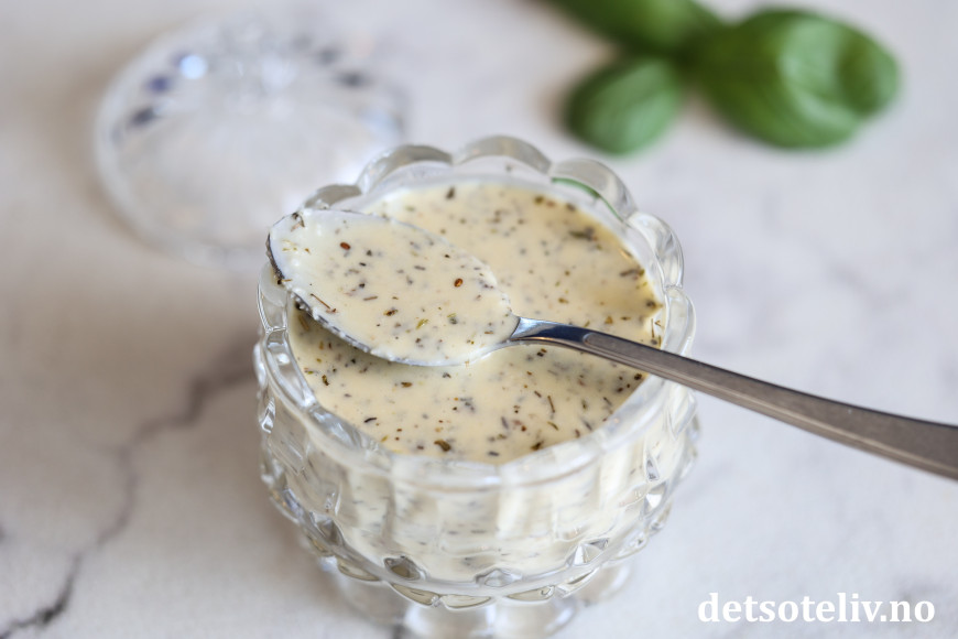 Nydelig, italiensk dressing med tørkede urter, litt hvitløk, honning og sitron. Majones og revet parmesan gir dressingen en herlig, kremet konsistens.