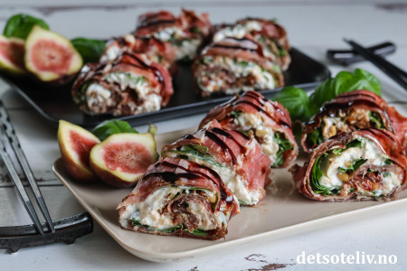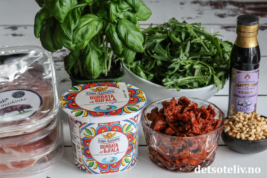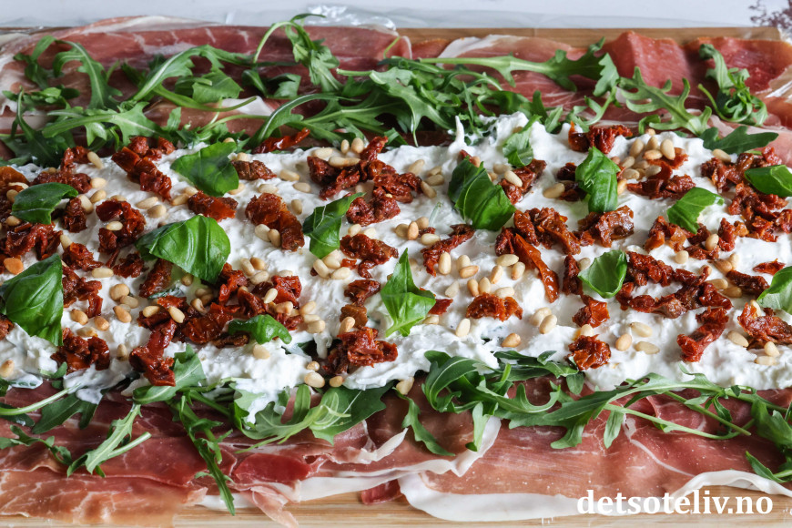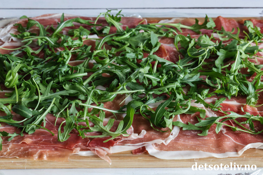 ♥ Jeg brukte det ikke her, men du kan smøre hjemmelaget pesto over skinkeskivene før du legger på ruccola.