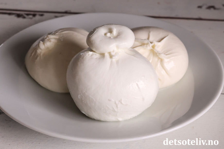 ♥ Burrata er en italiensk ferskost som består av fast mozzarella som fylles med en kremete ostemasse som lages av revet, fersk mozzarella og fløte (fyllet kalles for "stracciatella"). På samme måte som fersk mozzarella, ligger burrata i lettsaltet vann når du kjøper den. Du kan i stedet bruke fersk mozzarella som du skjærer i tynne skiver, men rullene blir da litt vanskeligere å rulle pent. Se flere oppskrifter med burrata HER.