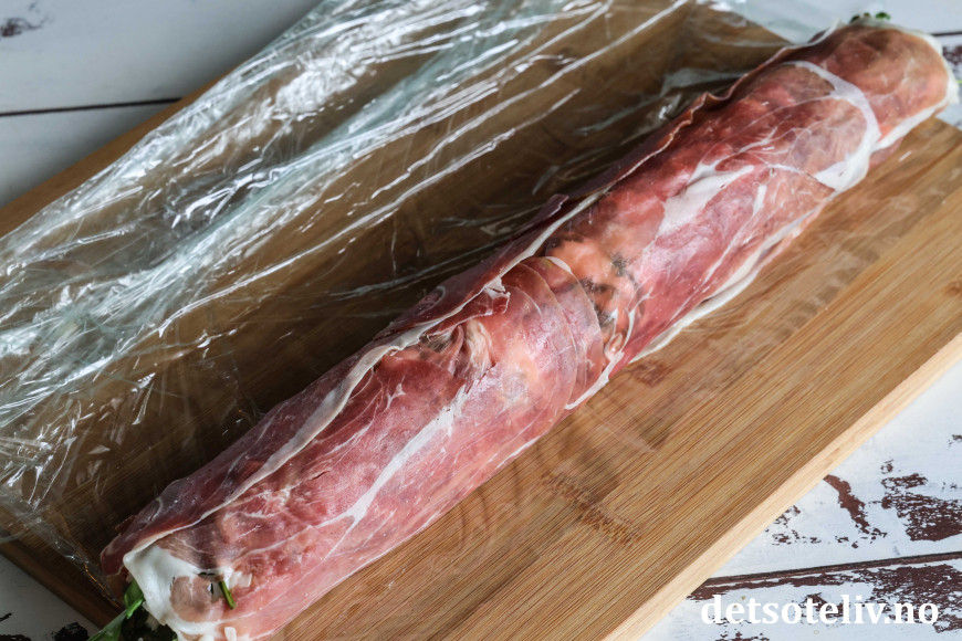 Ha plastfolie på et stort brett. Legg skinkeskivene på langs og overlappende, slik at de danner en tett firkant som dekker brettet. Vær nøye på at det ikke er noen sprekker mellom skinkeskivene. Det gjør ikke noe om skinken ligger litt dobbelt.