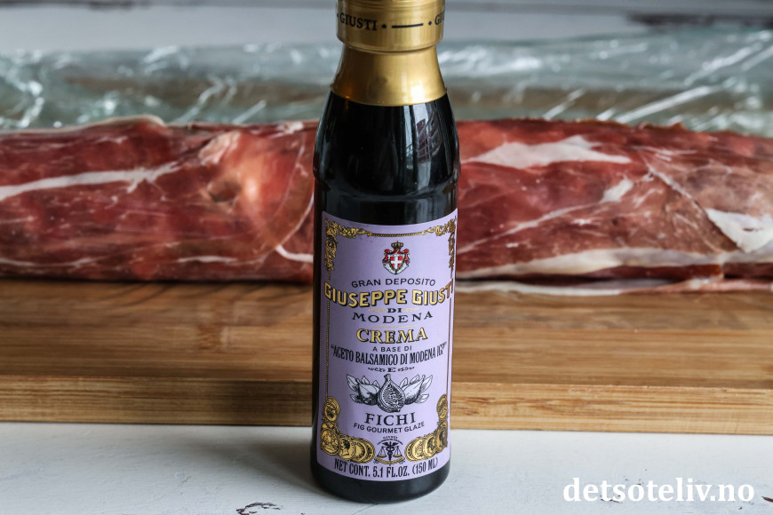 ♥ Crema di balsamico er en type glaze laget av balsamicoeddik som er tykkere og søtere enn ren balsamicoeddik. Fås kjøpt i de fleste velassorterte matvarebutikkene. Her brukte jeg en veldig god type med smak av fiken.