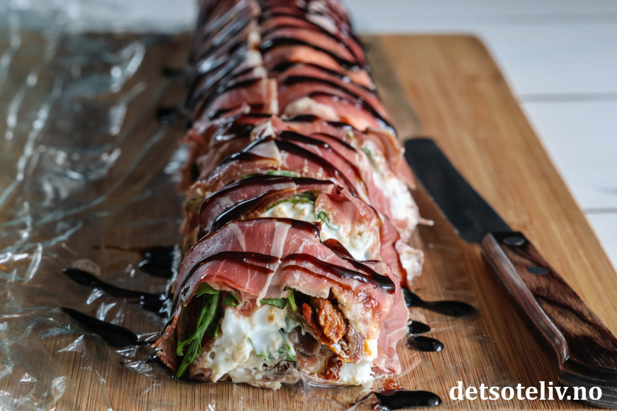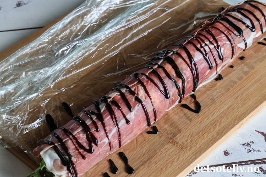 Ta så tak i plastfolien og rull skinkefirkanten stramt sammen til en lang rull. Ringle over balsamicoglaze.