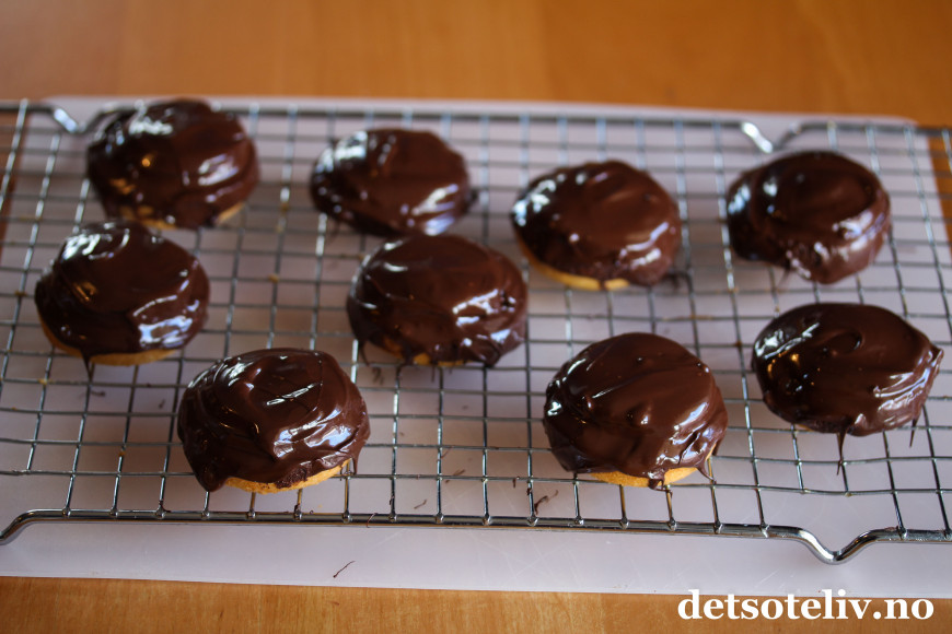 Glaser kakene med sjokoladen ved å øse sjokoladen over kakene med en teskje. Sett kakene på rist slik at de får dryppet av seg.