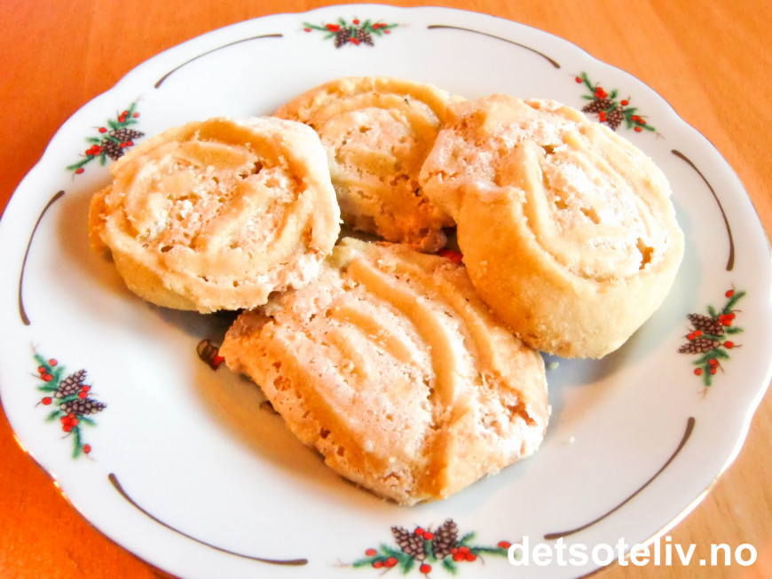 Skjær den iskalde rullen i skiver som er ca 1 cm tykk og legg dem på bakepapirdekkede stekeplater med litt god avstand imellom. Stek kakene midt i ovnen ved 150°C i ca 20 min. Avkjøles på rist.