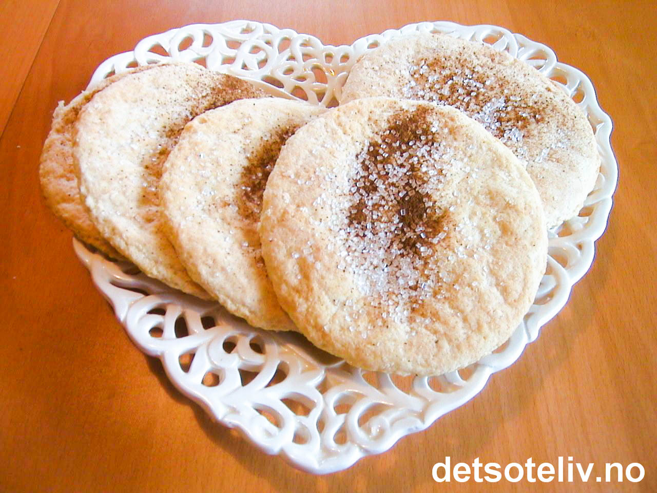 Ha mel på bakebordet og kjevle ut deigen. Stikk ut store runde kaker. Legg kakene på stekeplater dekket med bakepapir. Prikk kakene et par ganger med en gaffel. Strø deretter over sukker og eventuelt litt kanel.