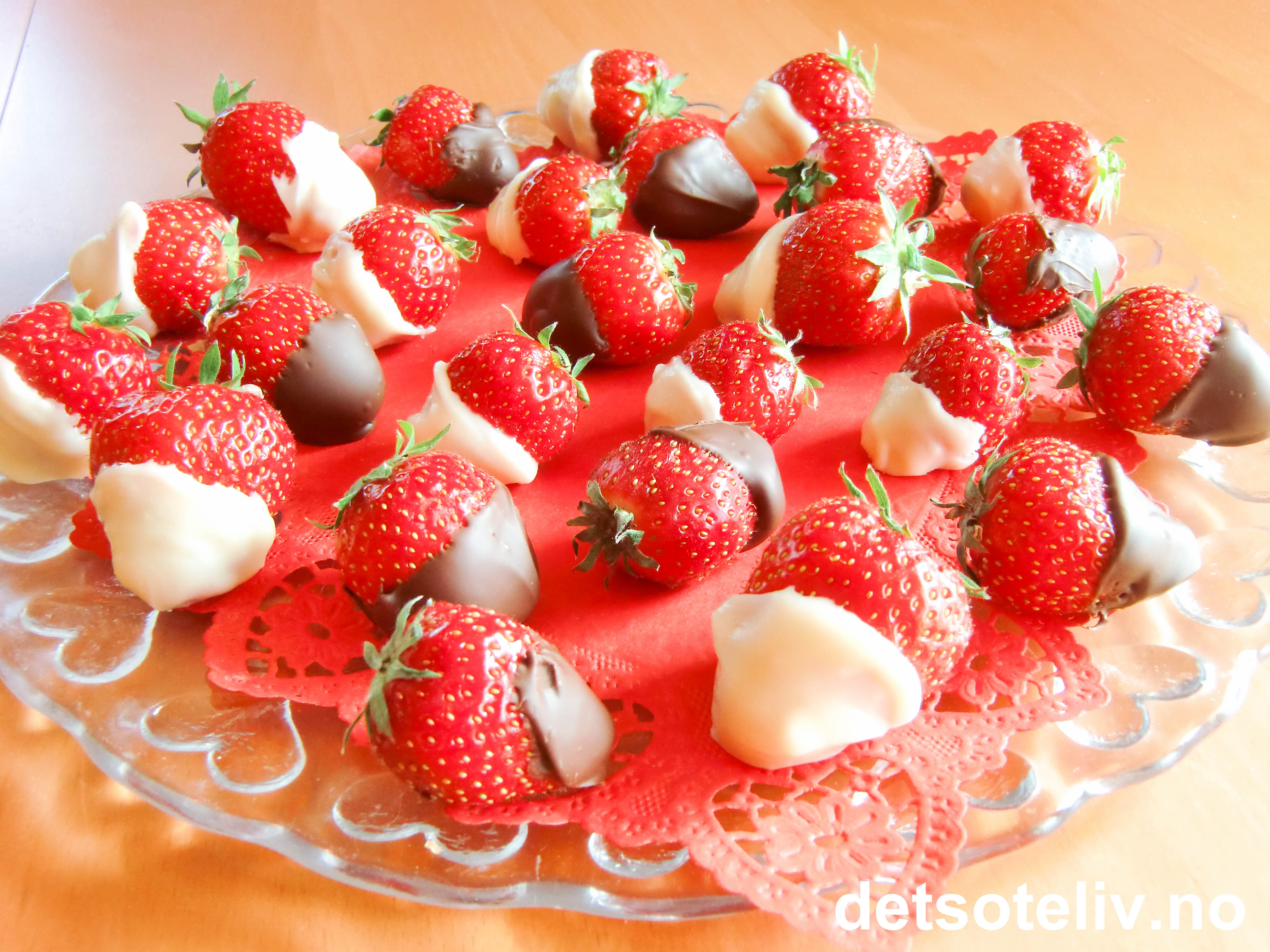 Dypp jordbærene i smeltet sjokolade og legg dem på et brett som er dekket med bakepapir. Sett brettet i kjøleskapet til sjokoladen har stivnet.