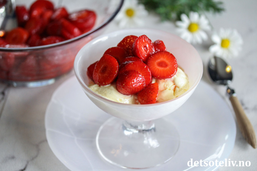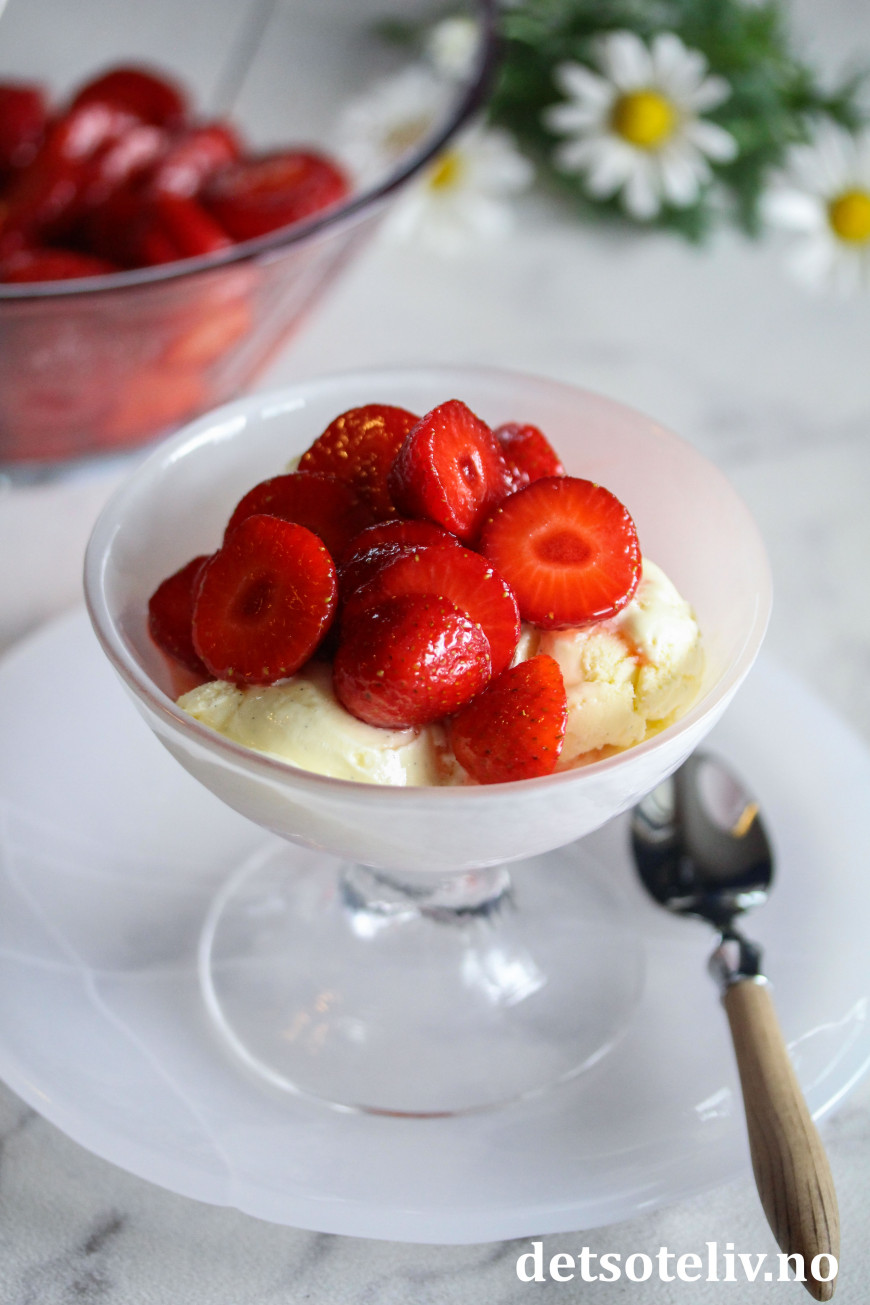 ♥ I stedet for iskrem, kan du helle fløtemelk over jordbærene. Fløtemelken blander seg da med jordbærsausen slik at du får jordbær i jordbærmelk! 😋
