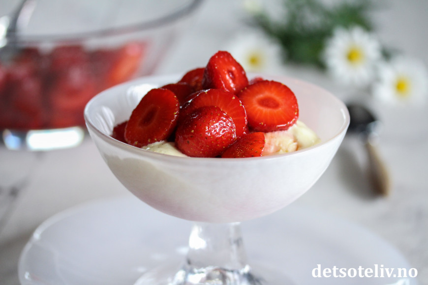 ♥ Se også Jordbær med krem, Jordbær med fløte, Jordbær med mascarponekrem, Jordbær med hvit sjokoladesaus og Jordbær med vaniljesaus og Stratos!