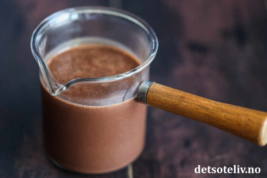 ♥ Oppbevar sjokoladesausen i romtemperatur. Setter du den i kjøleskapet over natten, kommer den til å bli stiv i konsistensen, men det går fint å varme den opp igjen, enten i mikroen eller på svak varme på platen, slik at den blir flytende igjen.