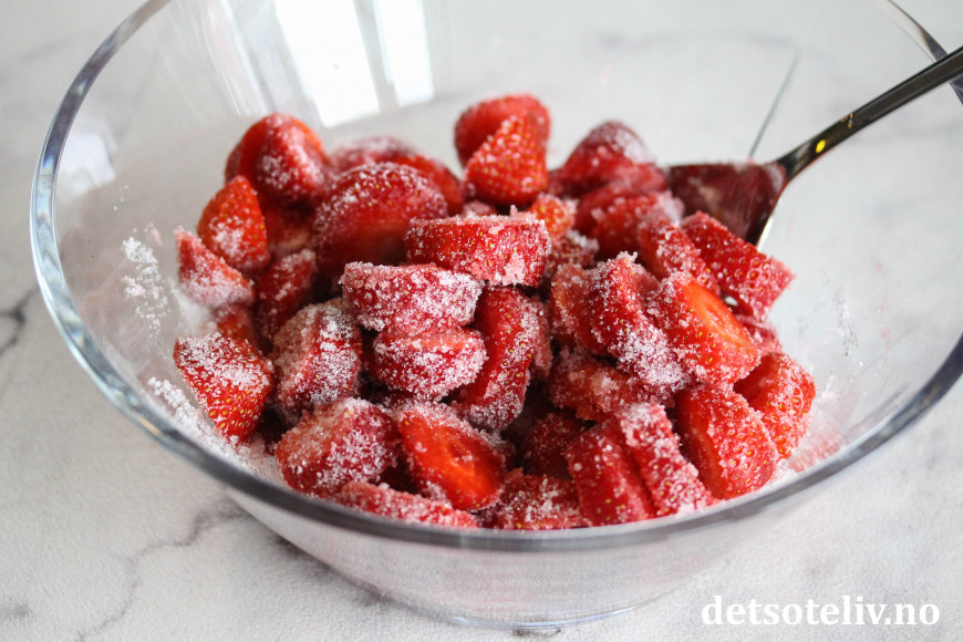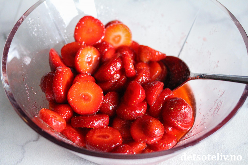 Rens jordbærene og del dem i skiver. Ha jordbærskivene i en skål og dryss over sukker. Bland sammen slik at sukkeret fordeler seg fint på alle jordbærbitene.