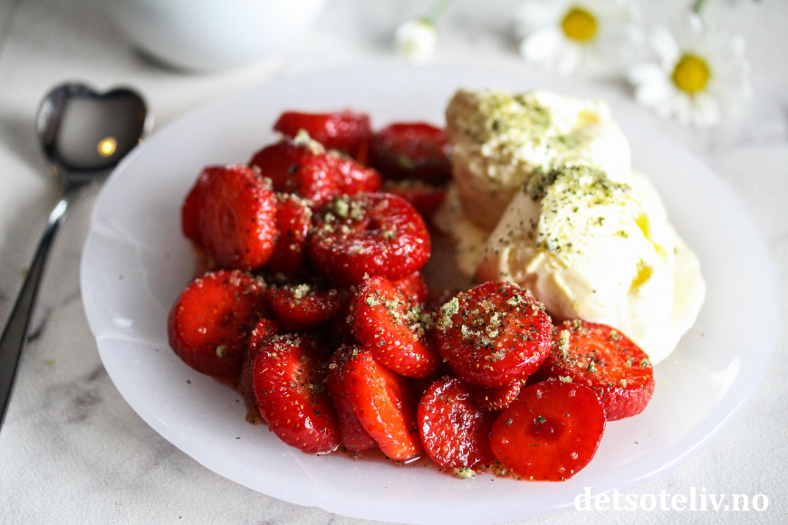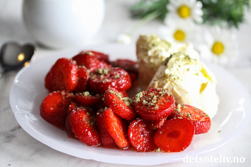 Jordbær med jordbærsaus og iskrem er noe alle liker.