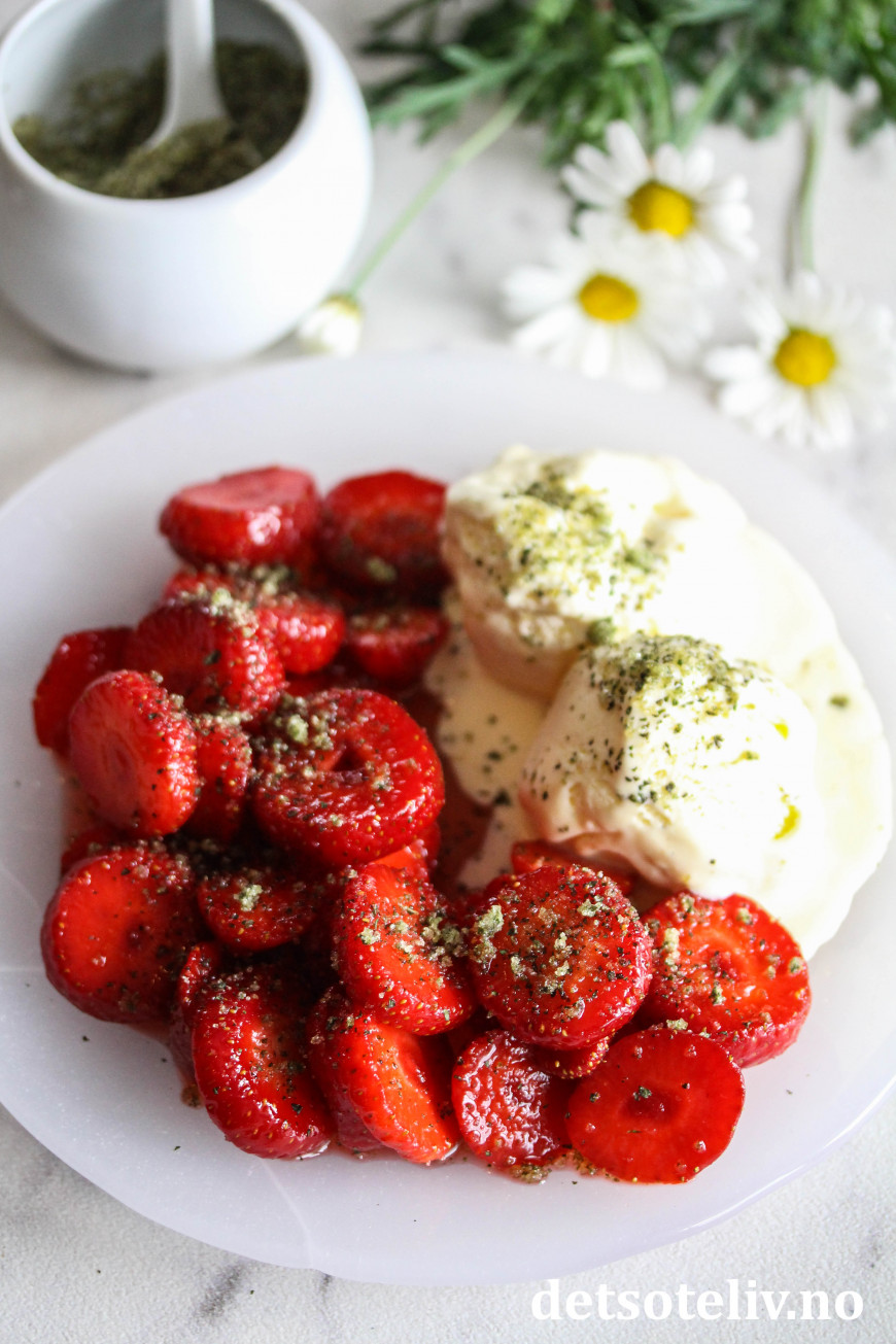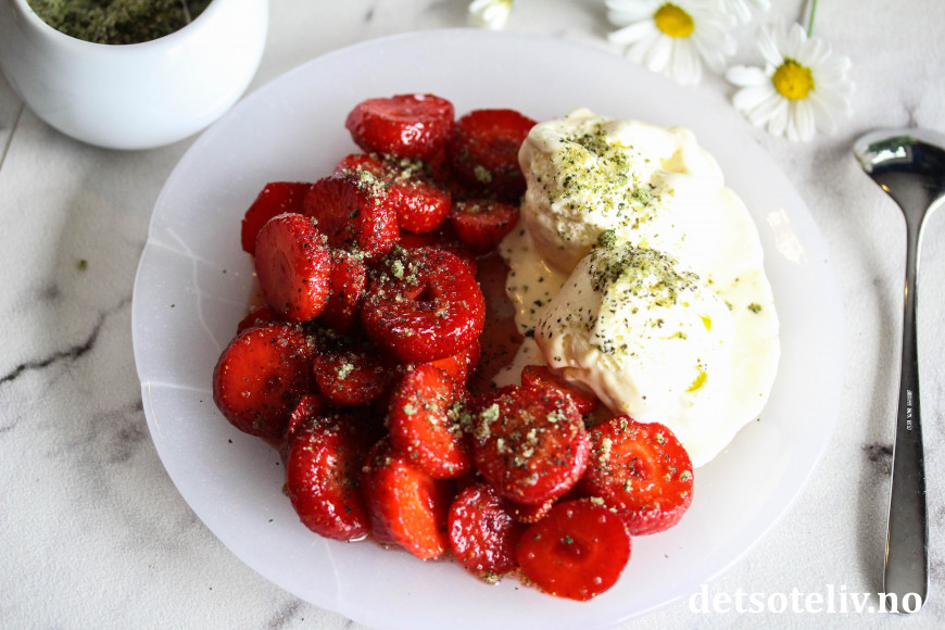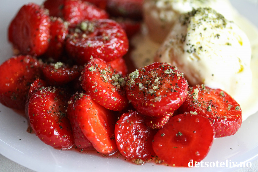Server jordbærene med vaniljeis og dryss over myntesukker.