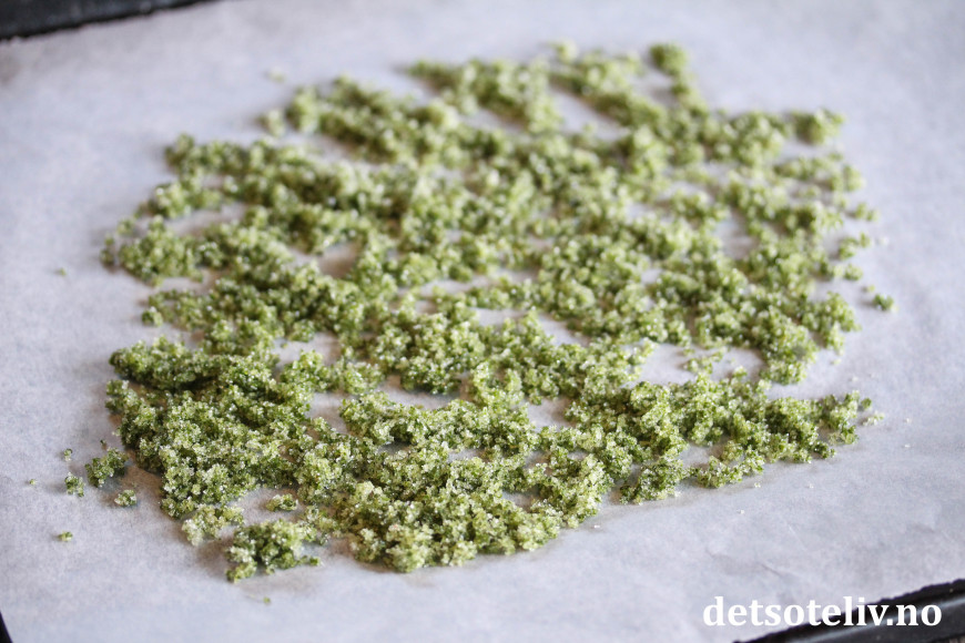 Hvis du ønsker å speede opp prosessen, kan myntesukkeret også tørkes i stekeovnen på lav varme. Det fungerer fint å sette platen midt i ovnen i stekeovnen og tørke sukkeret på 85°C i ca. 40 minutter.