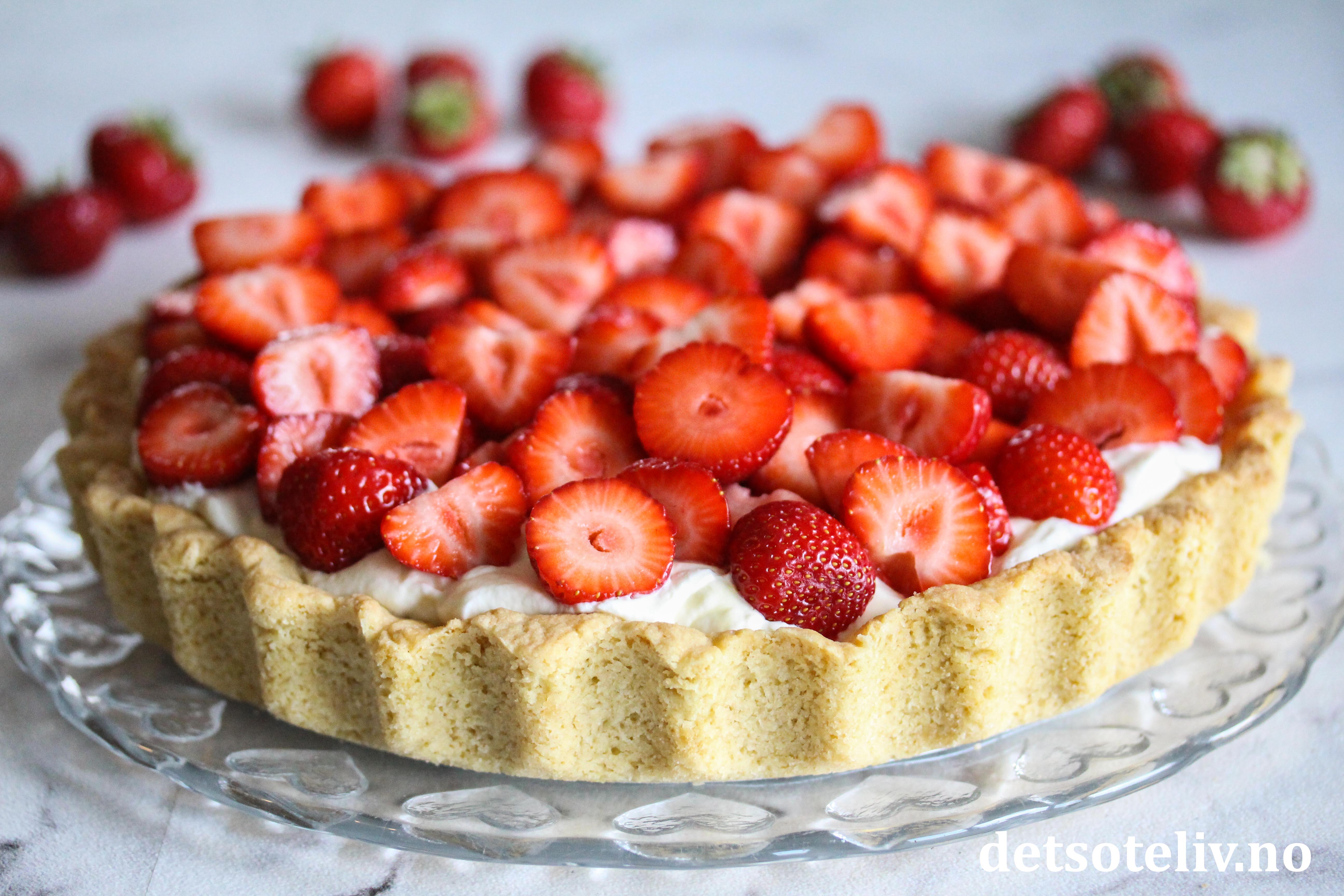 En veldig god sommerkake som er enkel å lage: søt mørdeigspai fylt med vaniljekrem og masse friske, deilige jordbær!
