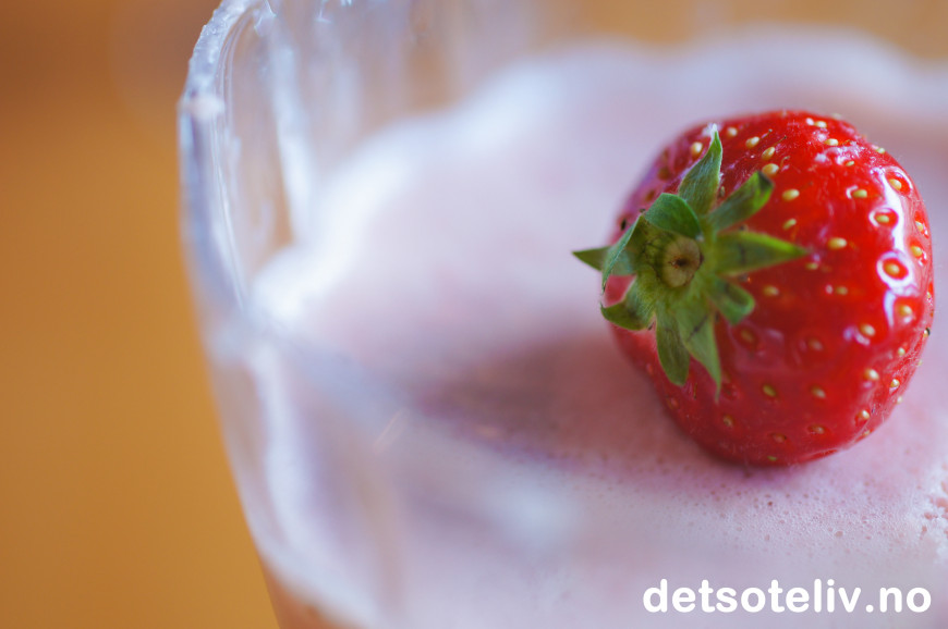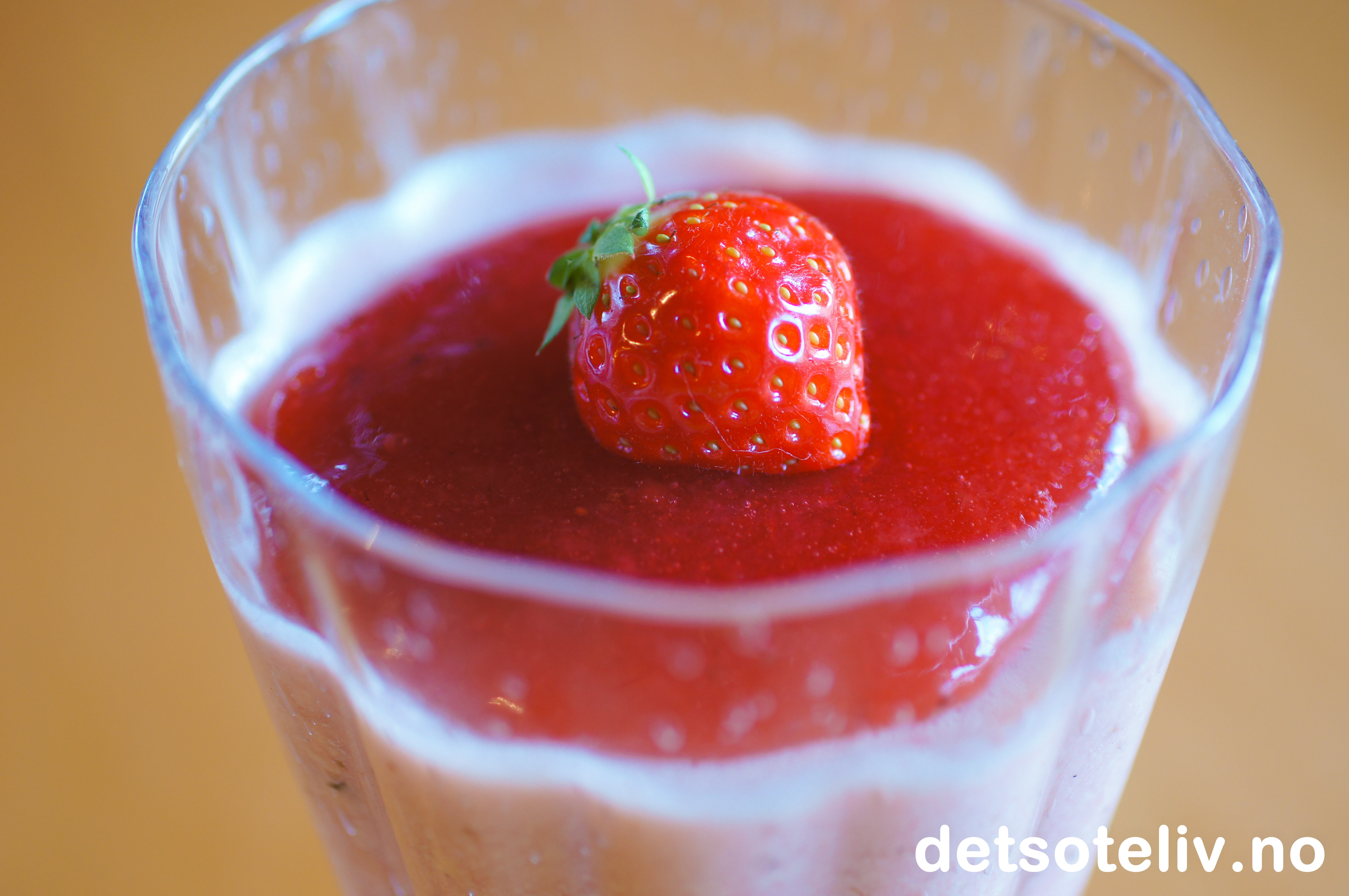 Ha et tynt lag jordbærsaus oppå desserten før servering, og pynt gjerne også med et lite jordbær.
