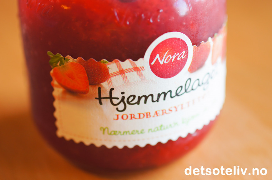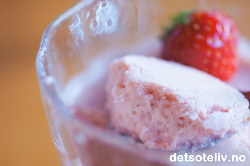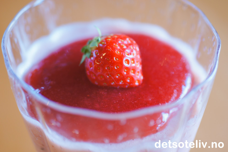 Enda bedre blir panna cottaen likevel servert med litt jordbærsaus på toppen.