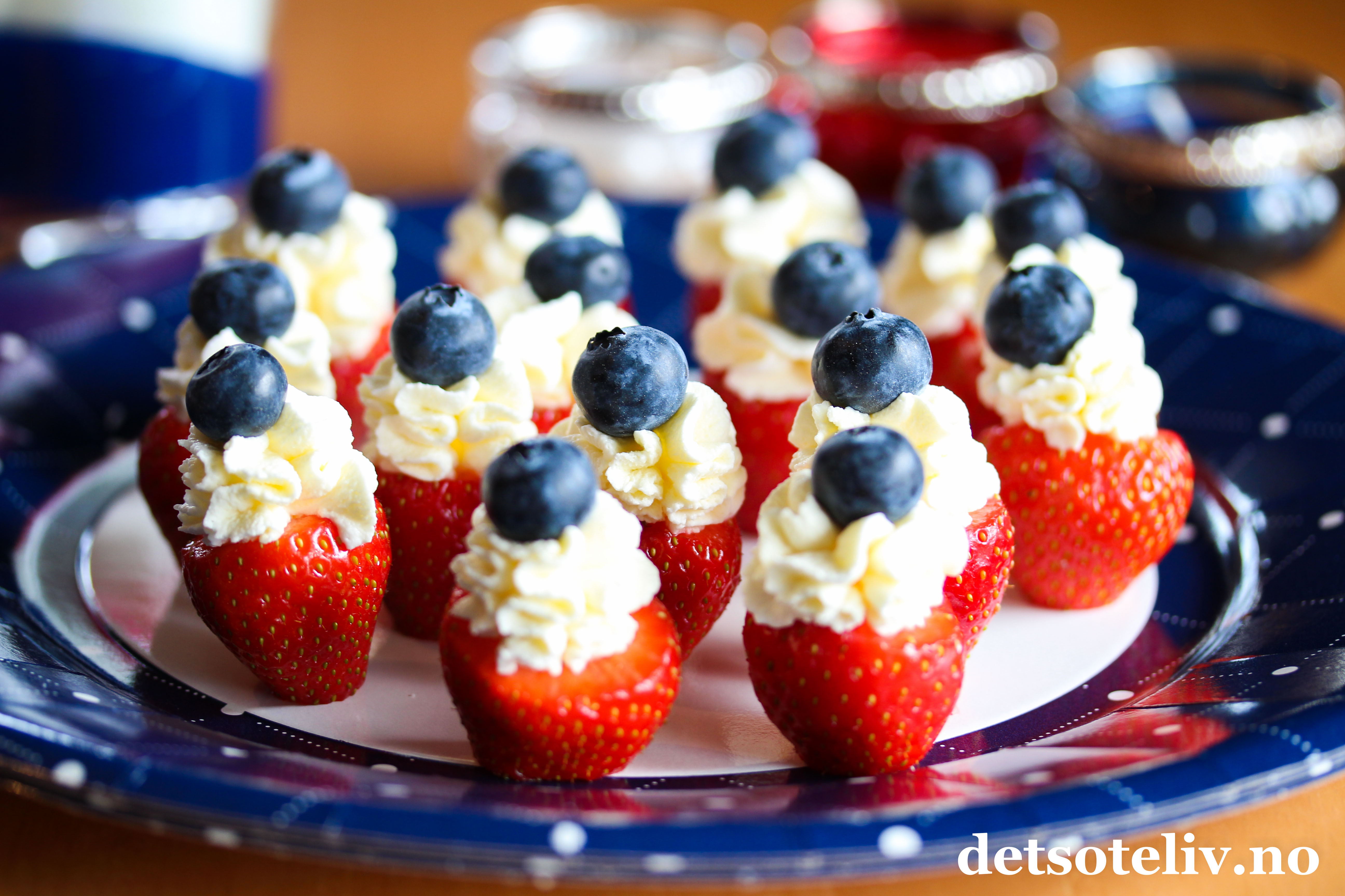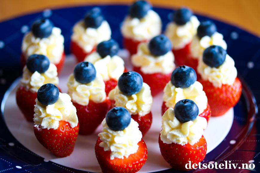 Dette er søte jordbær som jeg lagde til årets 17. mai-feiring, men er selvsagt morsomme bær man kan servere gjennom hele sommeren også.