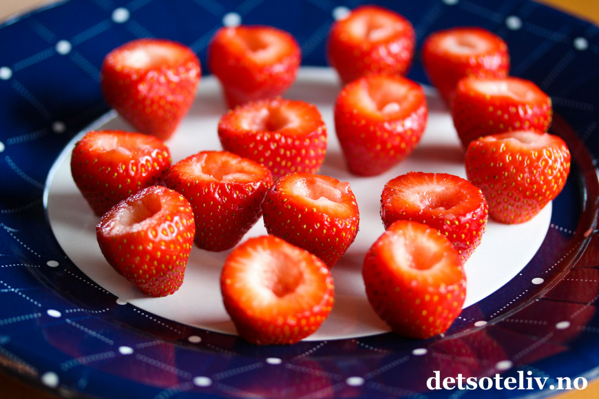 Rens jordbærene. Skjær av litt i enden så de står støtt og hul ut jordbærene litt på toppen.