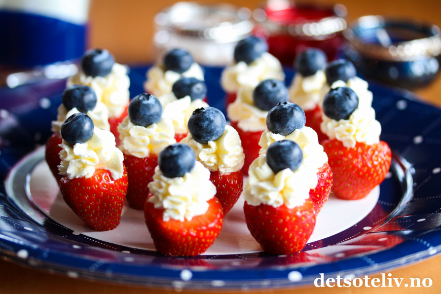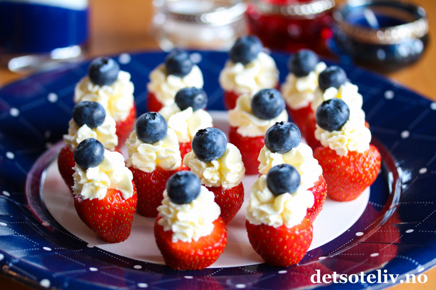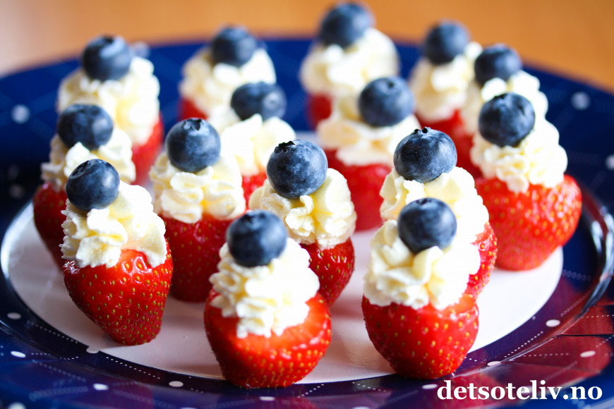 ♥ I stedet for søt, pisket krem, kan du sprøyte ostekrem eller sjokoladekrem på jordbærene.