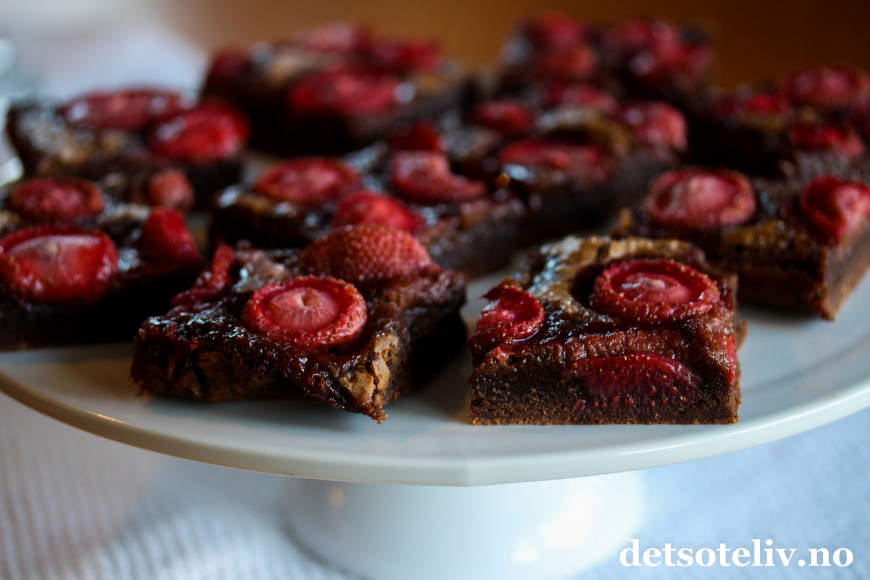 "Jordbærbrownies" består av myke, mørke og fuktige brownies som er dekket med jordbærskiver før steking. Resultatet blir HIMMELSK GODE sommerbrownies!