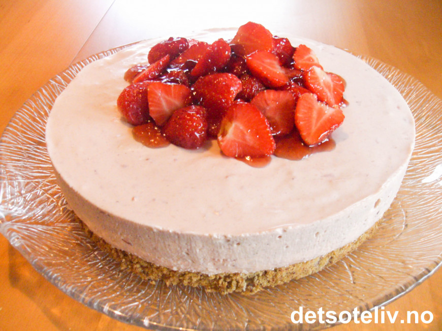 Personlig synes jeg at denne kaken blir best med nokså mye jordbærsyltetøy. I kaken på bildet brukte jeg faktisk 500 g syltetøy (Noras hjemmelagde jordbærsyltetøy). Hvis du vil at kaken skal få god jordbærsmak uten å bli altfor søt, lønner det seg å bruke et syltetøy med litt mindre sukkerinnhold.