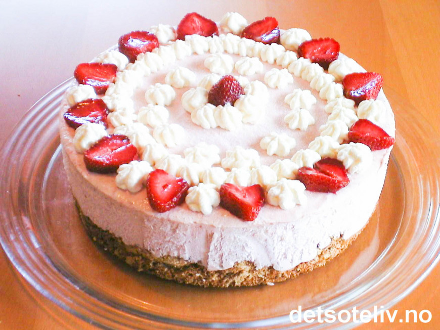 Vær oppmerksom på at dette er en STOR kake. På bildet er det brukt en rund kakeform på 26 cm i diameter, og da går jordbærisen HELT til toppen av formen.