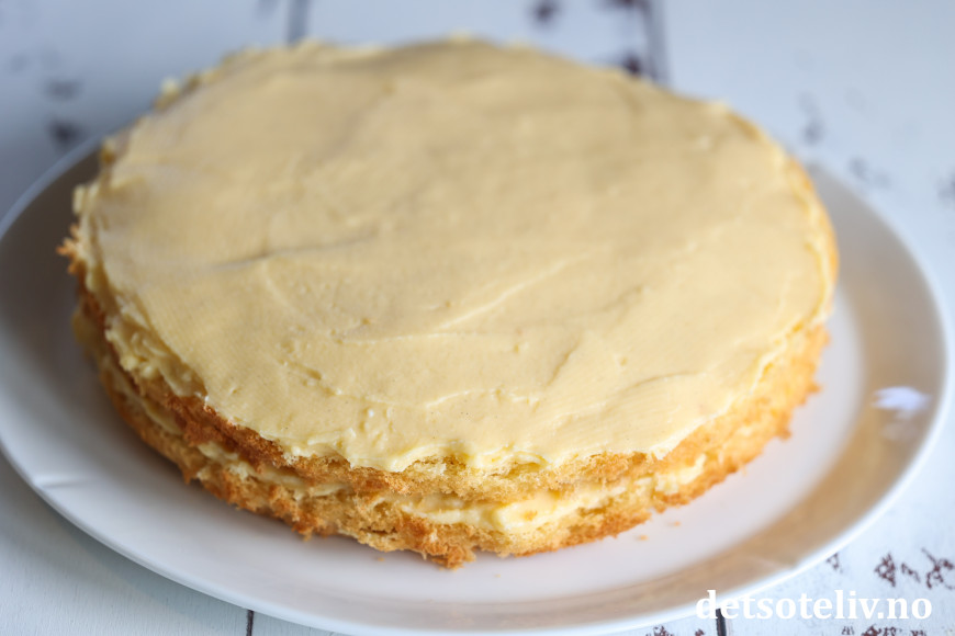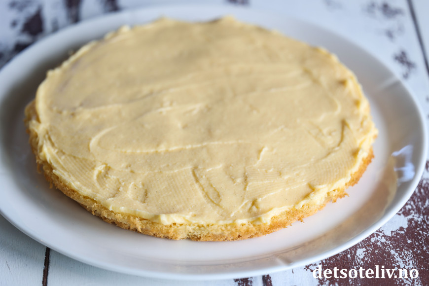Ha på den andre kakebunnen og smør over resten av vaniljekremen.
