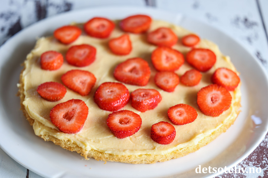 Ha på den andre kakebunnen og smør over resten av vaniljekremen. Legg på et nytt lag med friske jordbær i skiver.