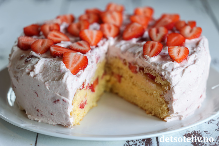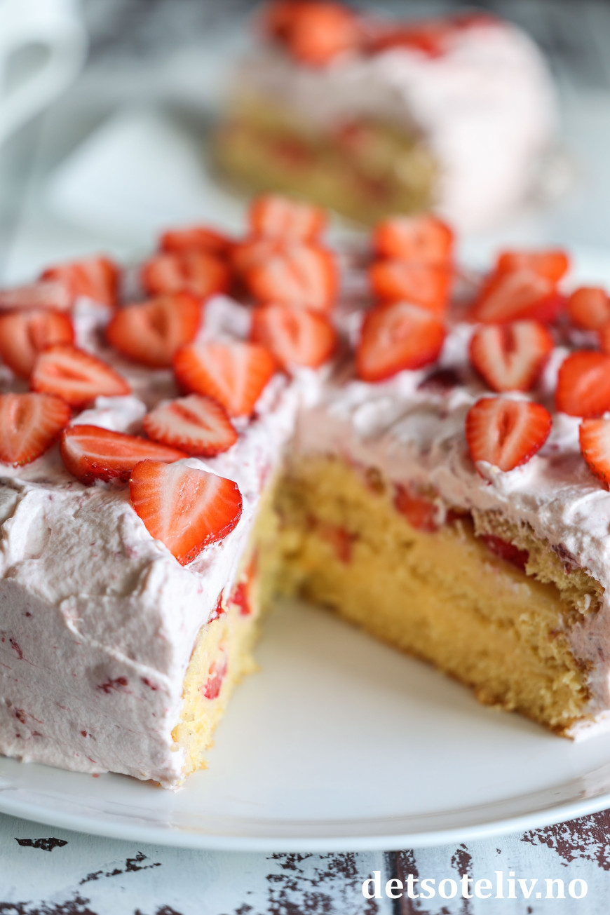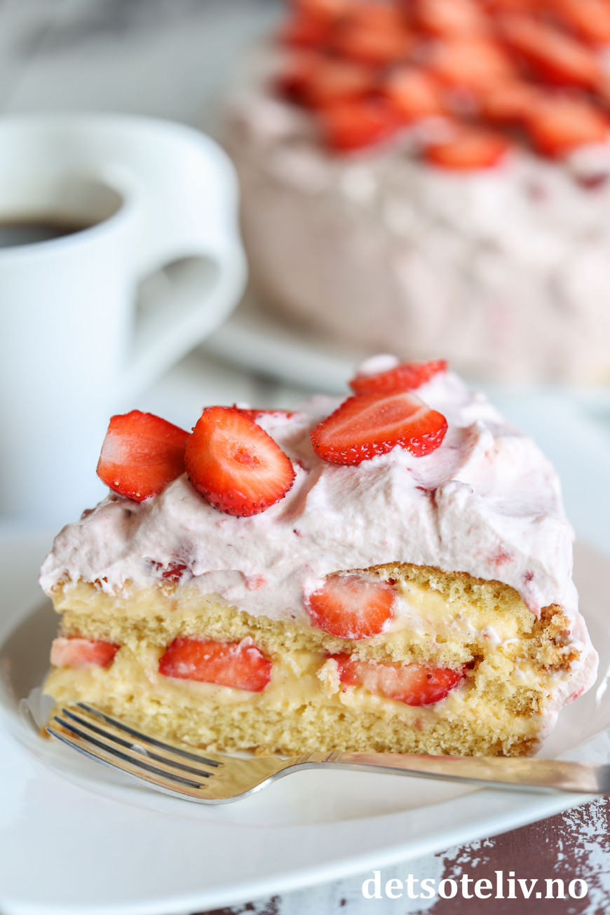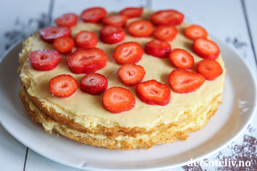 Denne kaken består av en luftig sukkerbrødsbunn som jeg har fylt i to lag med hjemmelaget vaniljekrem og friske jordbær.