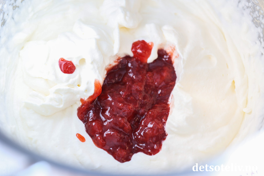 Pisk kremfløten til fast krem. Vend inn tykt jordbærsyltetøy.